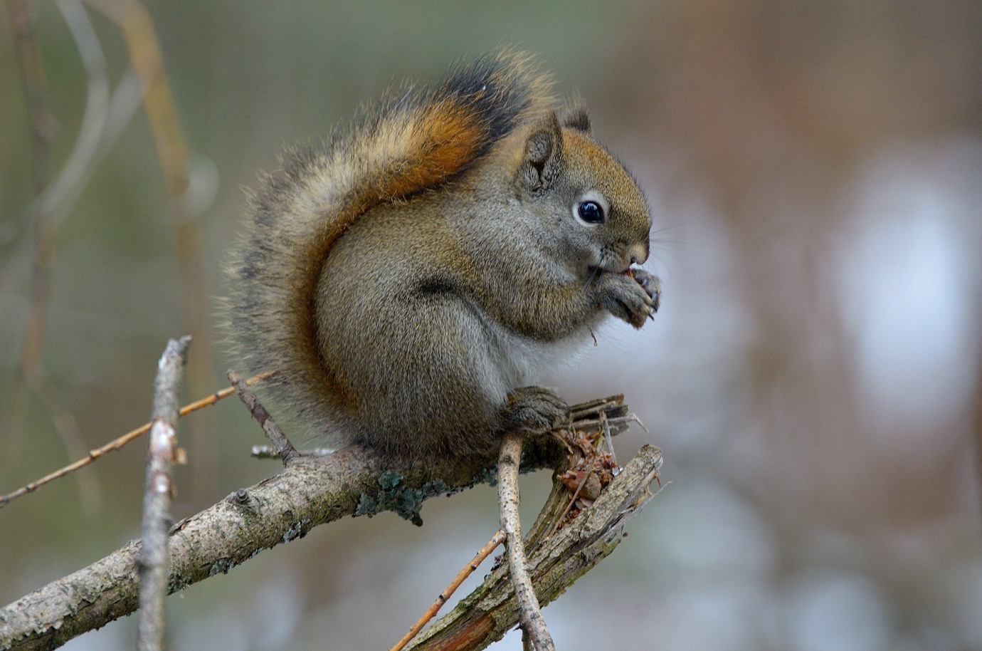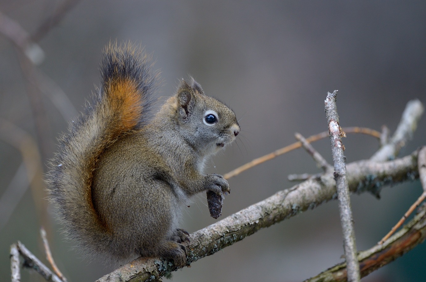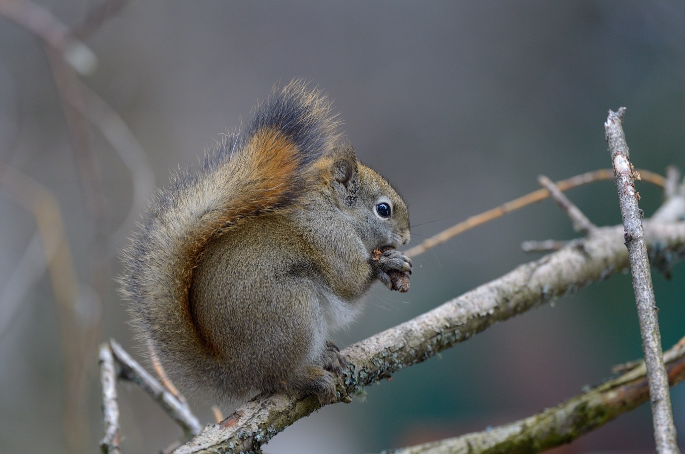 I have become quite fond of the squirrel, my closest neighbor. Squirrels in Alaska are nothing like the ones stealing peanuts in the parks, they can be quite skittish, although at times pretty noisy compared to their European counterparts. There is a lot of competition among squirrels, and this one, while really tiny, seems very healthy and is doing very well. It also seems that it has warmed up to my presence, which has been very convenient with the arrival of the 300/4 PF. Since I already posted a number of squirrel images in the PF thread, the new ones go here. All captures with VR on. The last one was captured with TC-14E mounted and was actually the first in the shot sequence, but because of the overcast murky weather and no need for it, I soon unmounted it. I actually like these images better than the ones I made in sunny weather. While squirrels are almost ideal subjects for VR use because of their stop-motion movement pattern, it can be tricky to avoid motion blur when they are eating like here.