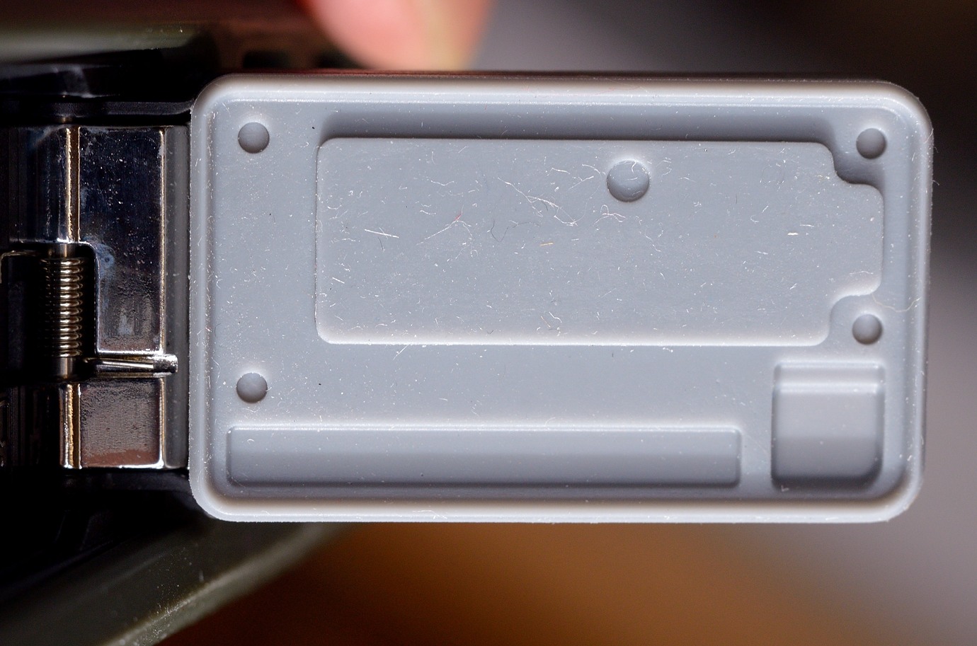 The ports over the battery compartment and connector port has an unusual looking gasket type seal. A common misunderstanding I have seen in various forums is to use silicone grease to maintain these gasket seals. There is nothing in the manual about using the supplied silicone grease on anything but the o-ring at the mount. There it is used to ensure that the o-ring can move freely in the grove, not to actually cause a seal. If grease is applied to the gaskets it could possibly function to "help" water pressure to push the sealing lip in, as there is nothing holding against it, particularly on the port seal. We do not want that. The gasket is somewhat sticky which helps to keep it in place, but also adheres dust and small hairs. This stickiness transfers to the sealing surface too, which now and then need a bit more cleaning than can be done with a blower, so careful inspection of the narrow gasket lip and sealing surfaces is imperative. (I prefer to do so with a pair of strong reading glasses).