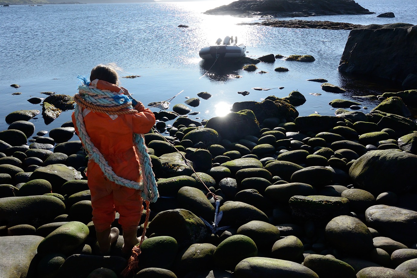 To begin with I only bought the AW1 with the standard 11-27.5mm kit lens, as I thought the 10mm lens was too close in coverage. The first testing in the ocean happened in Vesterålen in Northern Norway last August. I helped my brother and the young composer and artist Tine Surel collect material that had drifted onto this exposed beach for a planned sound sculpture project in Nyksund. We donned survival suits to wade ashore on the extremely slippy round rocks. It was unavoidable that the AW1 took several dips in the water after being repeately sprayed during the boat trip. The lens front stayed remarkably clean of water drops and stains: