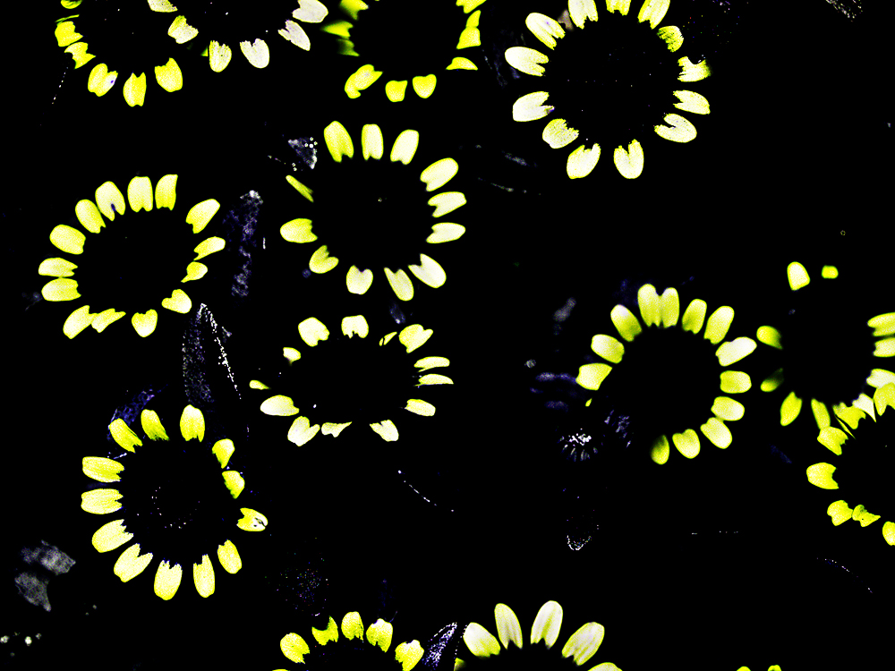 31. From a trip to Western Norway, I acquired this capture of Creeping Zinnias. This is of course not a plant native to Norway (or to Europe for that matter), but it looks pretty in UV nevertheless. Panasonic GH-2 with the Coastal APO 60 mm f/4 lens, hand-held. The graphic outcome appealed to me and more than made up for the lack of sharpness cased by hand holding a camera at such slow speed.