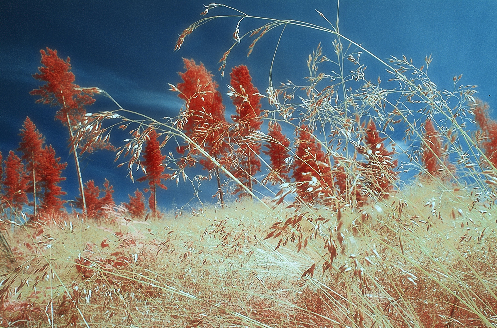 32. One of the results from a traditional weekend hike together with my girl friend (going on a trip into nature in the weekend is one of the few traditions that defines Norwegian culture, by the way. Cannot be a true Norwegian unless you join force with such activity). A recent cutting field in the deep conifer forests had entered the stage of lush grass growth (from internal fertilisation by decomposition of biomass, so field must be 3-4 years of age). This was a lovely autumn day with vibrantly deep blue sky and since we were inland, I could crawl around in the grass without fear of ticks for a change. Fuji S3 and the 20 mm f/4 Nikkor.