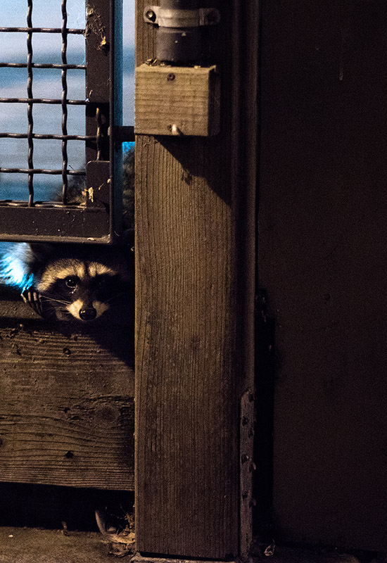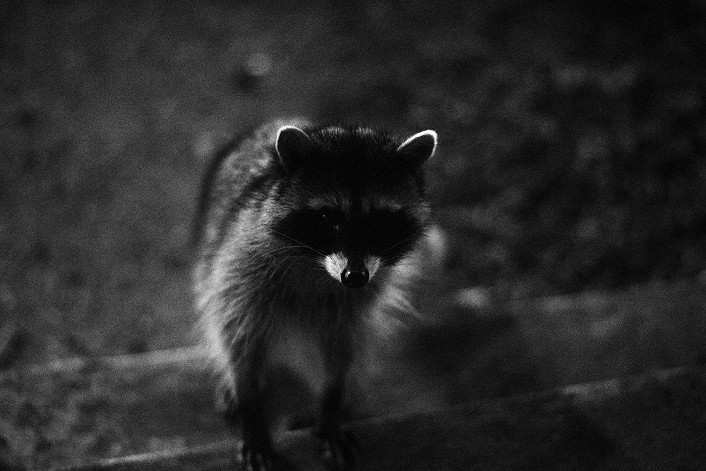 Here is my contribution - D5100, 50mm f1.8 @ f2.8, ISO 6400, ambient light (porch light), shot with remote release beneath bird feeder at front door, cropped. I suppose this one is officially a suburban raccoon.