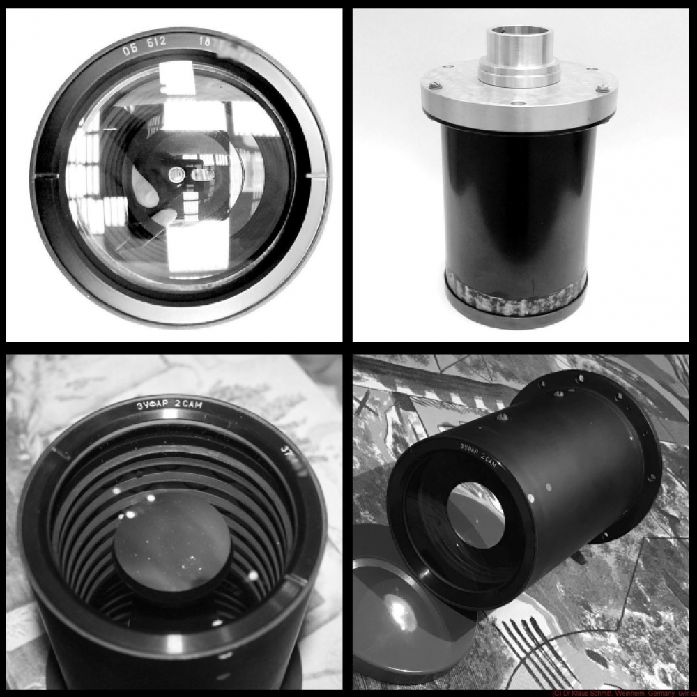 Bit larger, quite heavier the prototype was - they changed the materials for the final product and saved aprox 20% weight (2.2 kilograms down to 1.8 ), very important for a 1976 space lens. The technical data of the final lens got also improved, viewing angle from approx. 3 degrees to 5 degrees, UV-VIS transmission from >50% to >57% (200-700nm). Back focal length remained at 51mm, very useful for a later adaptation...