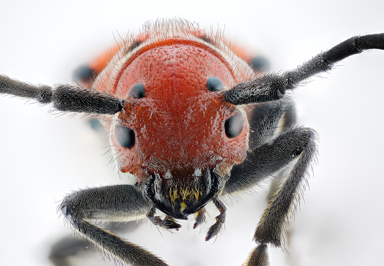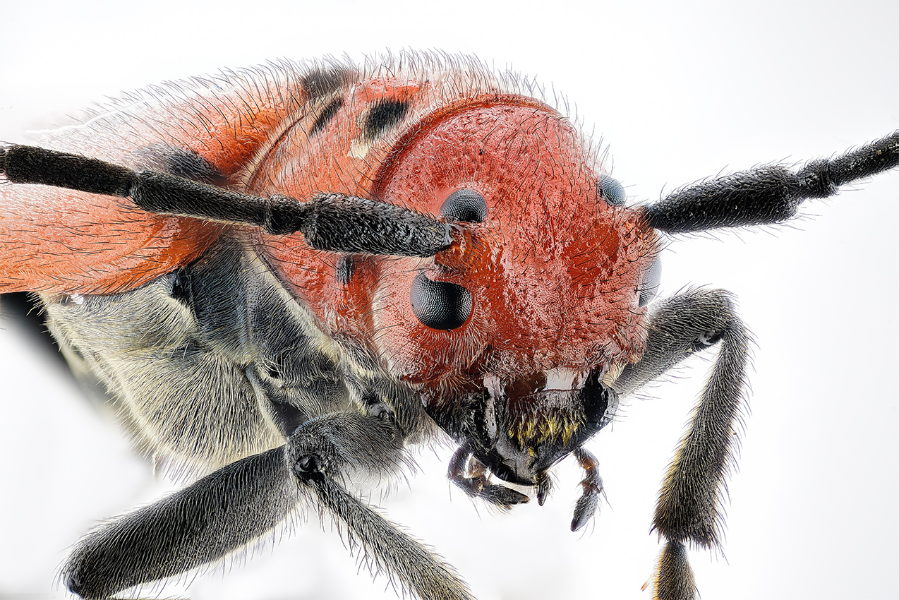 "This is a beetle, one of the Milkweed Longhorns, likely Tetraopes tetrophthalmus though I don't have enough references to be sure from a head shot.