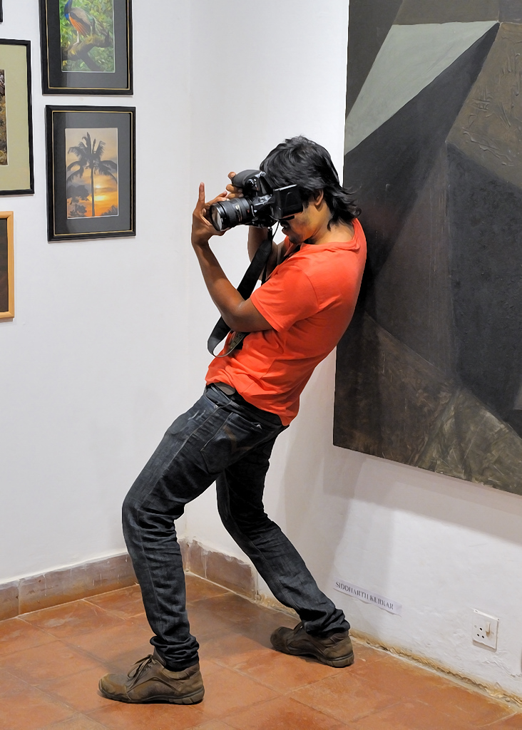 The local Society Press photog covering an Art Exhibition .  He rarely gets photographed so  I 'camped' this version up the image up and he printed A2 and it hangs on his wall.  He preferred to the B&W and colour with normal PP  ;) .