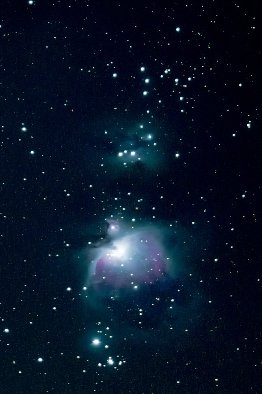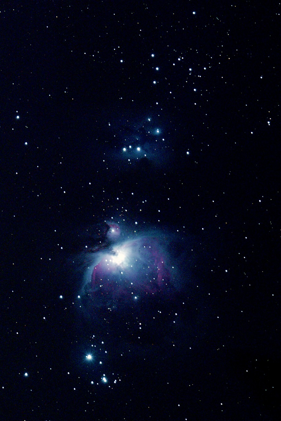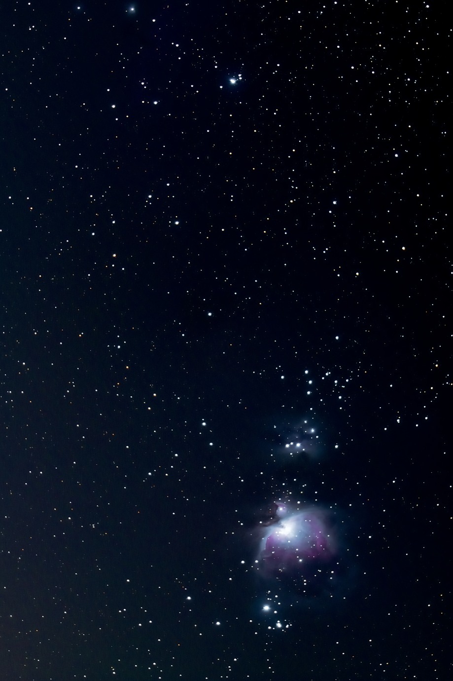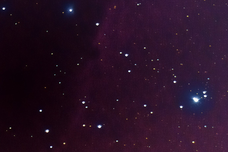In the upper left of the frame above one is supposed to have the Horsehead Nebula. These kind of nebulas emit a lot of their light at the hydrogen alpha line of 656 nm, and modified cameras are often used and then give very red images. I wondered if it would be possible to detect at all through all that light pollution. With some extreme processing and noise reduction, this is what I came up with. The horsehead is in the upper left.   ;D   I believe the more purple color is caused by more contributions from lines of other elements. I have seen wonderful images from this region even from non-modified DSLRs, so I am looking forward to try this at a really dark site.