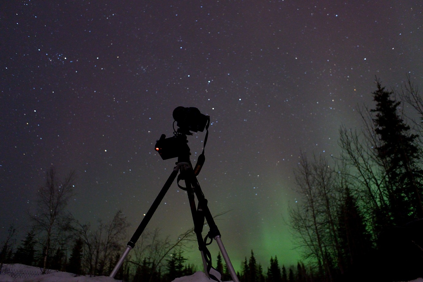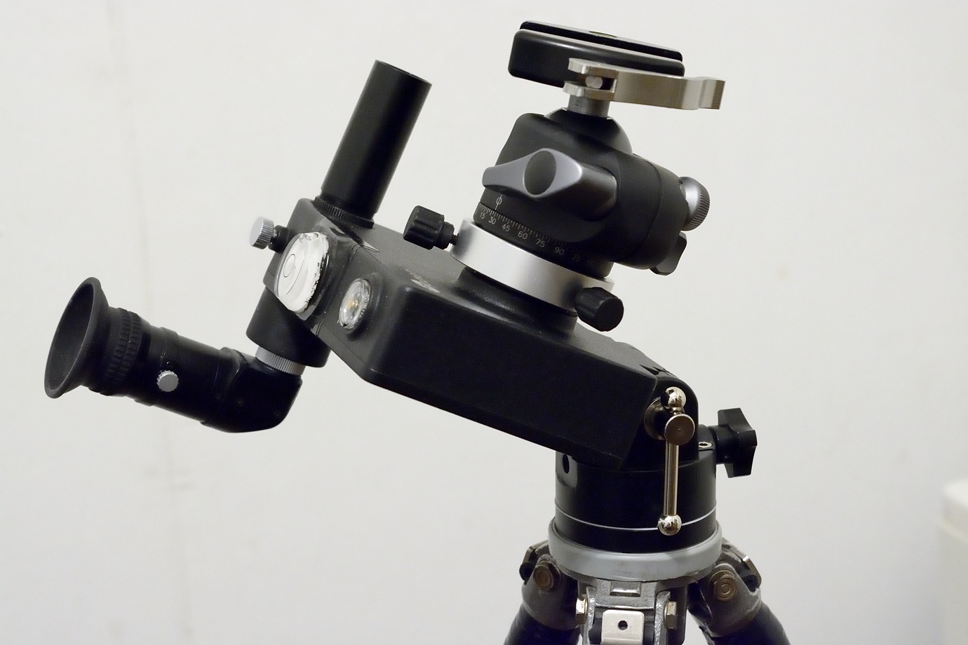 1. I mount the iOptron Skytracker directly to the tripod in the zero position of the altitude adjustment with the front facing towards the far tripod leg, I place the tripod with that leg pointing north, fine adjust direction with the rotating base using a hand compass (taking deviation of magnetic north into consideration, +18° in Fairbanks!) and level it (with a the level I added by adjusting and taping it to the top).