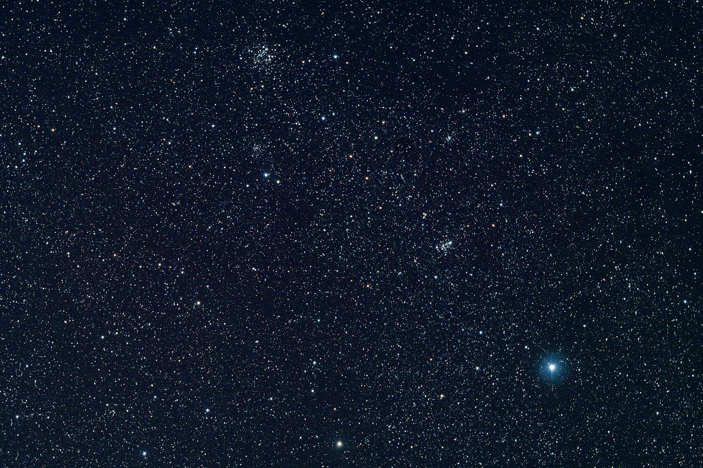 Then finally a 13 image stack of some starry sky (M103 star heap to the middle right), 60 sec, 300mm f/4.5 ISO 1600. The lack of purple fringing in highlights (that otherwise could cause discoloration of small stars) with this lens is really a treat.