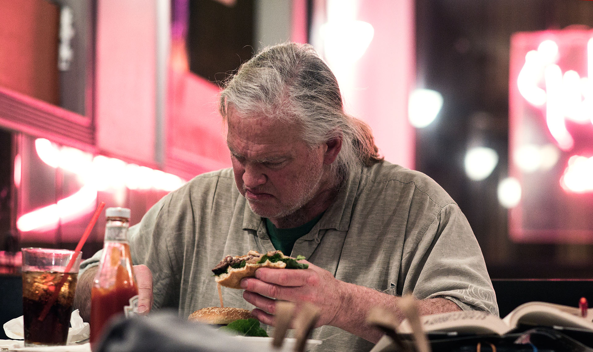 Great shot.  Weather he is displeased with his burger or something else is part of what makes the shot.