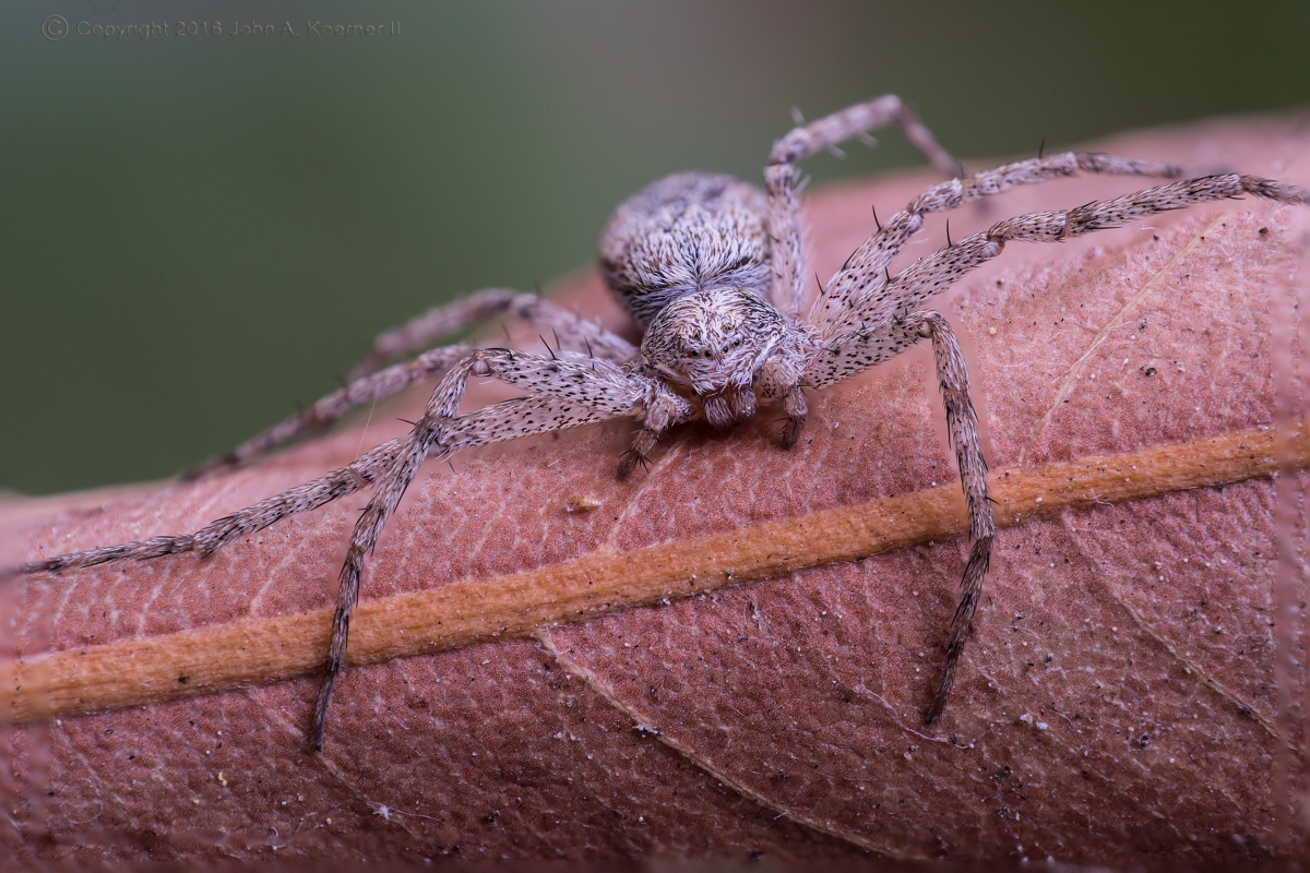 Philodromus sp.) | Nikon D810, Nikon 28mm f/2.8 Ai-S, reverse-mounted (2:1), tripod, remote, natural light, stacked (17 images).