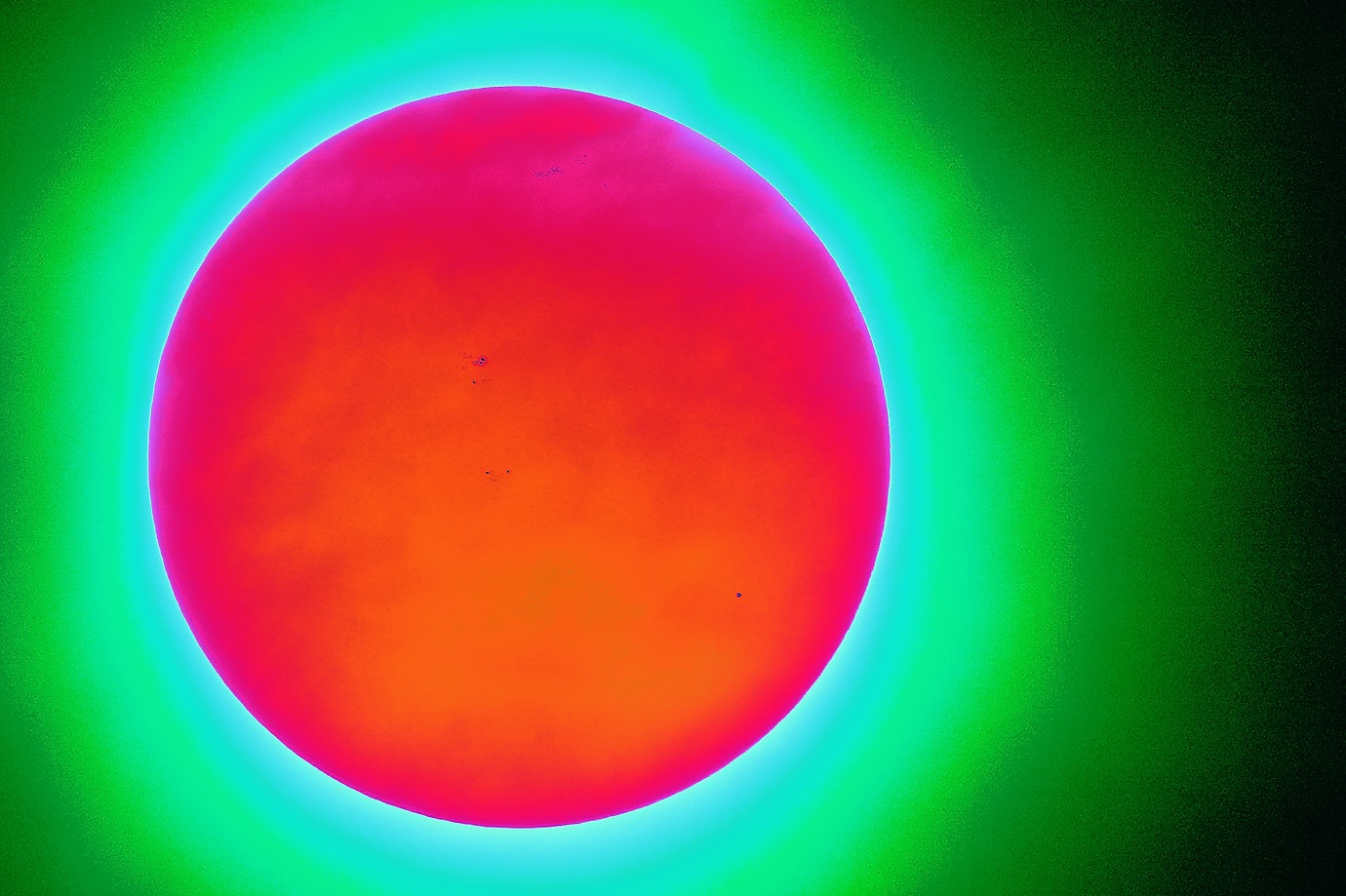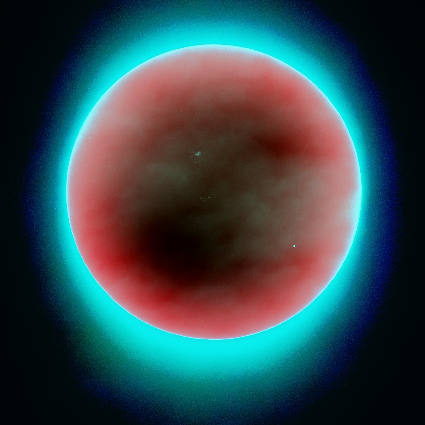 Here are the first results. I got down the road to a place with a free view and set up my tracker and lens. the very first frame in false colors (using AW-1 for all images), still with clouds drifting in front of the sun: