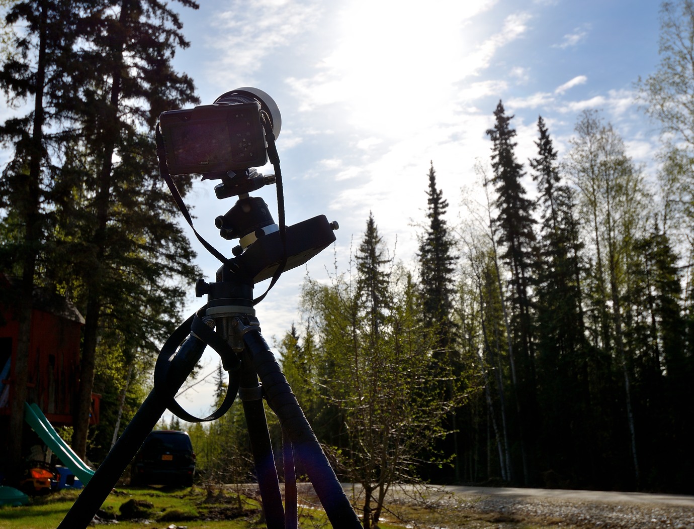 Nice images here and in the Scotland thread! I was up before 5 AM hoping to image the sun above the large satellite dish at the university (UAF), but thick dark clouds were located in the north-east where the sun should be rising. Up again at 8 am, but still cloudy if a little better -may be there was hope.... At 9 am I could finally see sharper distinction between light and shade although still mostly cloudy. A quick inspection in the binoculars and I could see Mercury and the sun outlined sharply! Never give up hope!
