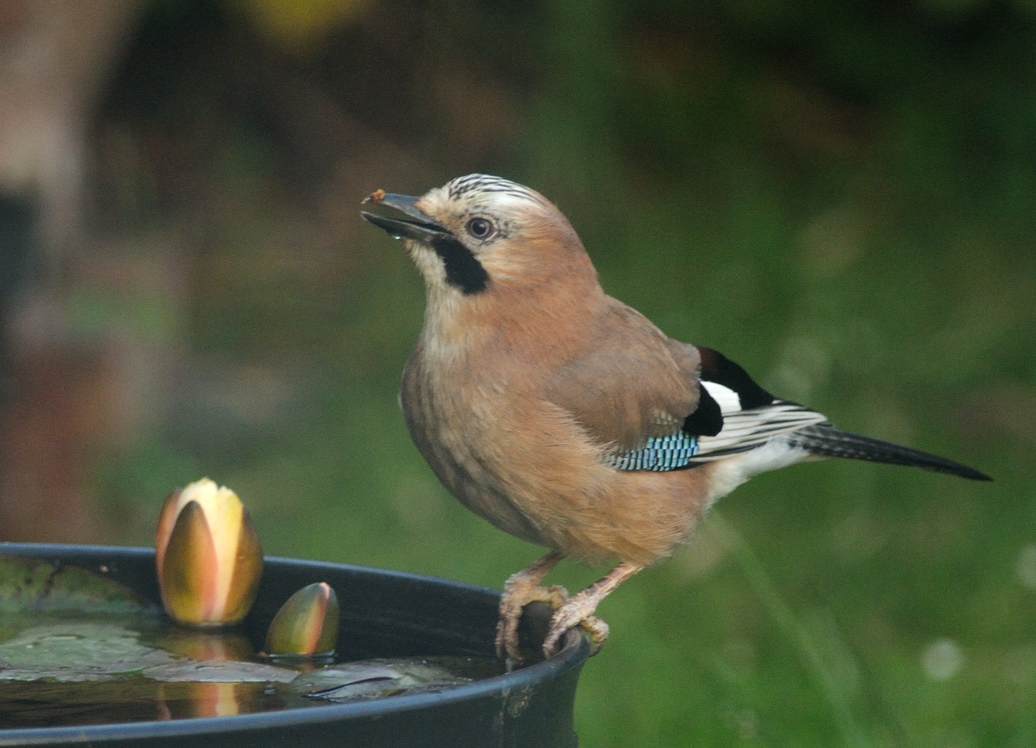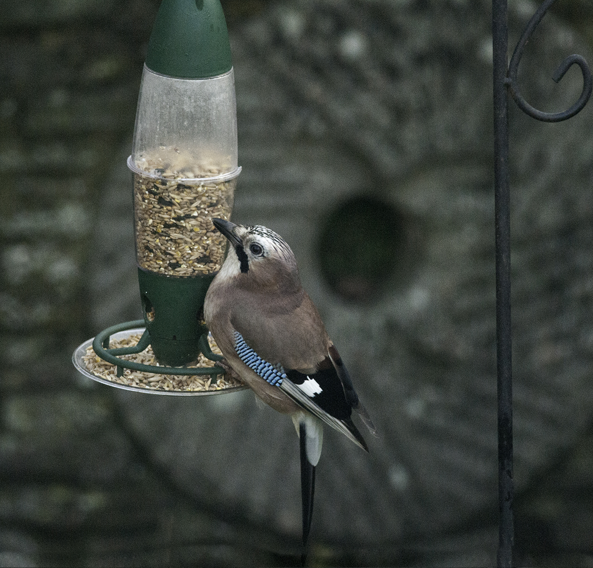 I may soon get the chance it seems. This morning I heard more squawking than usual from the garden and was surprised to see five Jays hopping around playfully! Not sure yet but we wonder if this might be two parents plus their offspring. They are very wary of unexpected movement or sound, plus unpredictable on when they visit, so it could take a while to take some more shots.