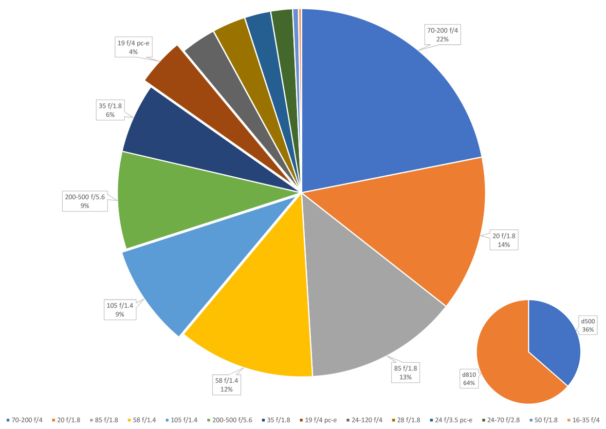 Out of the little over 10'000 images which were retained (a multiple of this in clicks, but I dont have the stats) in the Lightroom (Lr) catalog, during 2016, about 28% were taken with the 300mm f/2.8 VRII (*), followed by 26% with the 28-300mm f/4.5-5.6, and 15% with the 16-35mm f/4 (all Nikkor lenses). The high percentage of 300mm pictures is attributable to the fact that I've spend most of my summer time on car racing circuits. About 78% of he pictures have been taken with the Nikon D5, the remainder with he D4s (sold in february 2016), the D610, but also 8% with smartphones (iPhone 6, and 6sPlus).