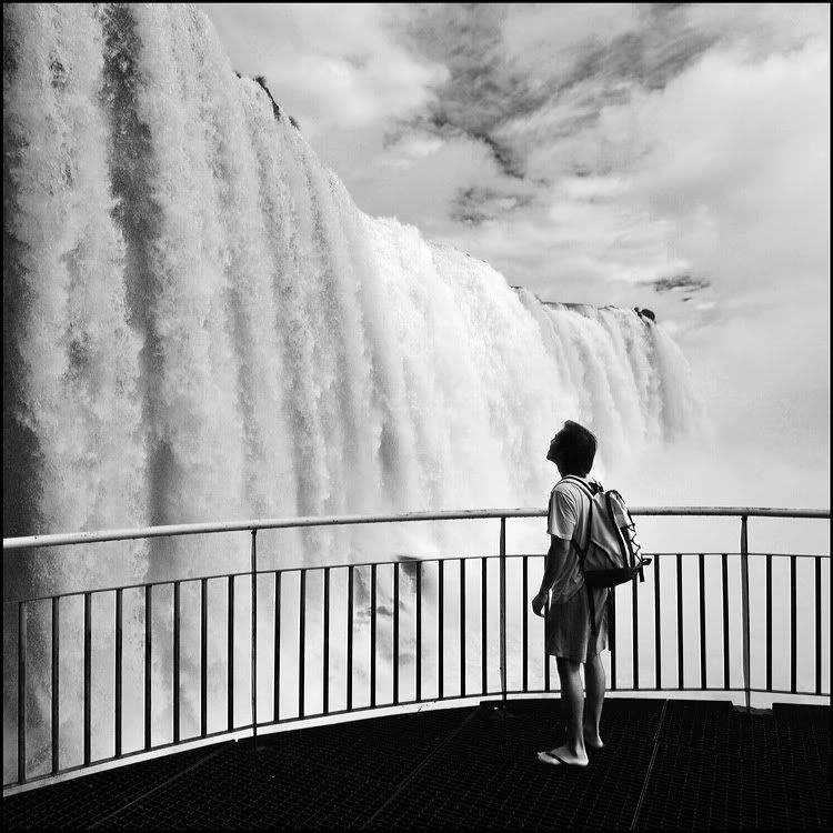 I like the combination of lines here, with the falls, the railing.  The upward gaze of the person, clouds, and mist in the air.  Well seen and captured.