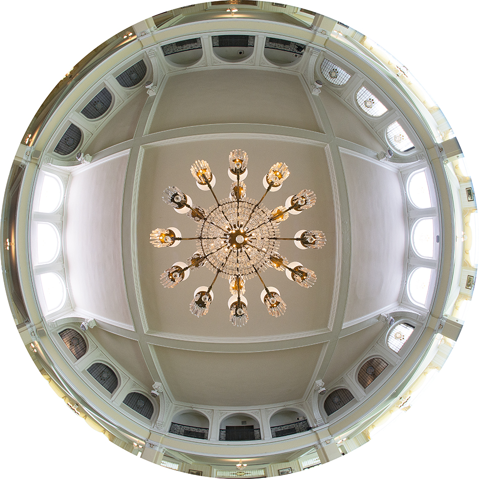 There is a shopping mall in the middle of Den Haag. In the middle is features a glass dome. Three alleys start there, two with bridges, one without. Symmetry is broken by a pink baloon: