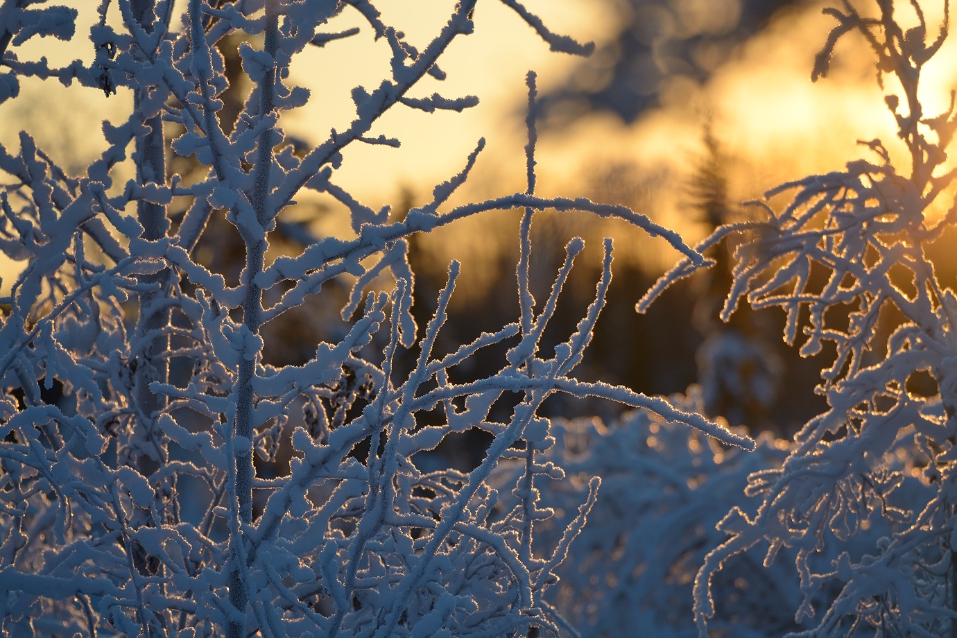 Beautiful mix of warm light with the branches covered in snow