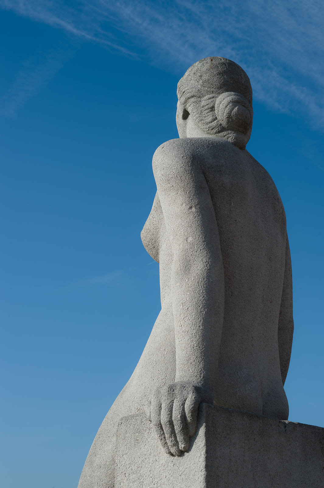 Elsa, you hit the nail right on the head. I was indeed intrigued by the contrast of the "dead" material and the "juvenile" figure. I do not know about the material, it looks like some sort of cement in a very bad condition, due to lacking surface treatment, and exposure to rain, frost, sun and pollution. I reduced the clarity in Lightroom to slightly mitigate its roughness. And no, the marks on the left arm are not due to vaccination.